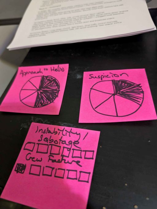 That’s it. I don’t need full transcripts, nor does it all need to be perfectly organised on campaign wikis. I find the latter incredibly burdensome – good intentions that I just can’t keep going long term. What works for me is a thin trail of breadcrumbs to help me pretend I knew where I was going. I swear by post its and their digital equivalent (such as Trello). Often things start on paper and get put on a digital board for later reference.